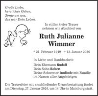 Große Liebe, herzliches Geben, Sorge um uns, das war Dein Leben. In stiller, tiefer Trauer nehmen wir Abschied von Ruth Julianne Wimmer * 21. Februar 1949 + 12. Januar 2026 In Liebe und Dankbarkeit: Dein Ehemann Rudolf Dein Sohn Robert Deine Schwester Irmlinde mit Familie im Namen aller Angehörigen Die Trauerfeier mit anschließender Urnenbestattung findet am Dienstag, 27. Januar 2026, um 14 Uhr in Mainburg statt.