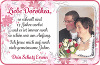 Liebe Dorothea, so schnell sind 17 Jahre vorbei und es ist immer noch so schön wie am Anfang. Ich freue mich auf noch viele gemeinsame Jahre. Dein Schatz Erwin