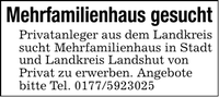Mehrfamilienhaus gesuchtPrivatanleger aus dem Landkreis sucht Mehrfamilienhaus in Stadt und Landkreis Landshut vonPrivat zu erwerben. Angebote bitte Tel. ***
