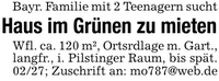Bayr. Familie mit 2 Teenagern sucht Haus im Grünen zu mieten Wfl. ca. 120 m², Ortsrdlage m. Gart., langfr., i. Pilstinger Raum, bis spät. 02/27; Zuschrift an: mo787@web.de