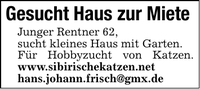 Gesucht Haus zur MieteJunger Rentner 62, sucht kleines Haus mit Garten. Für Hobbyzucht von Katzen. www.sibirischekatzen.nethans.johann.frisch@gmx.de