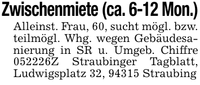 Zwischenmiete (ca. 6-12 Mon.)Alleinst. Frau, 60, sucht mögl. bzw. teilmögl. Whg. wegen Gebäudesanierung in SR u. Umgeb. Chiffre ***Z Straubinger Tagblatt, Ludwigsplatz 32, 94315 Straubing