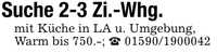 Suche 2-3 Zi.-Whg.mit Küche in LA u. Umgebung,Warm bis 750.-; _ ***