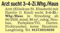 Arzt sucht 3-4-Zi.Whg./HausArzt (Klinikum St. Elisabeth) mit Familie (1 Kind) sucht 3-4-Zi.- Whg./Haus in Straubing ab ***, mind. 90 m², ruhig, Neubau, Parkplatz/TG, Garten. Nichtraucher, keine Haustiere. Langfristig. Tel. ***