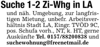 Suche 1-2 Zi-Whg in LA und näh. Umgebung, zur langfristigen Mietung, unbefr. Arbeitsverhältnis Stadt LA, Eingr. TVÖD 9C, pos. Schufa vorh., NT, k. HT, gerne Auskünfte Tel. *** und suchewohnung@freenetmail.de