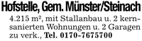 Hofstelle, Gem. Münster/Steinach4.215 m², mit Stallanbau u. 2 kernsanierten Wohnungen u. 2 Garagen zu verk., Tel. ***