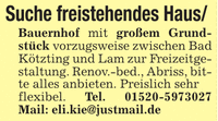 Suche freistehendes Haus/ Bauernhof mit großem Grundstück vorzugsweise zwischen Bad Kötzting und Lam zur Freizeitgestaltung. Renov.-bed., Abriss, bitte alles anbieten. Preislich sehrflexibel. Tel. *** Mail: eli.kie@justmail.de