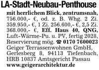 LA-Stadt-Neubau-Penthouse mit herrlichem Blick, zentrumsnah, 756.000,- €, od. z. B. Whg. 2 Zi. 359.950,- €, 1 Zi. 256.600,- €, 2,5 Zi. 368.000,- €, Eff. Haus 40, QNG, Luft-Wärme-Pu. u. PV, fertig 2028, Reservierung mög. _ ***Geiger Terrassenwohnen GmbH,Gerlesberg 8, 94113 Tiefenbach, HRB 10837 Amtsgericht Passauwww.geigerarchitektur.de