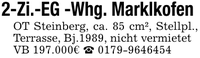 2-Zi.-EG -Whg. Marklkofen OT Steinberg, ca. 85 cm², Stellpl., Terrasse, Bj.1989, nicht vermietet VB 197.000€ _ ***