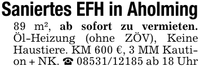 Saniertes EFH in Aholming89 m², ab sofort zu vermieten. Öl-Heizung (ohne ZÖV), Keine Haustiere. KM 600 €, 3 MM Kaution + NK. _ *** ab 18 Uhr