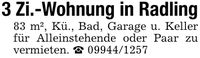 3 Zi.-Wohnung in Radling83 m², Kü., Bad, Garage u. Keller für Alleinstehende oder Paar zu vermieten. _ ***