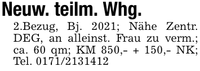 Neuw. teilm. Whg. 2.Bezug, Bj. 2021; Nähe Zentr. DEG, an alleinst. Frau zu verm.; ca. 60 qm; KM 850,- + 150,- NK; Tel. ***