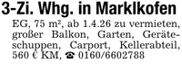 3-Zi. Whg. in MarklkofenEG, 75 m², ab 1.4.26 zu vermieten, großer Balkon, Garten, Geräteschuppen, Carport, Kellerabteil, 560 € KM, _ ***