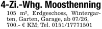 4-Zi.-Whg. Moosthenning105 m², Erdgeschoss, Wintergarten, Garten, Garage, ab 07/26,700.- € KM; Tel. ***
