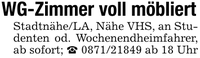 WG-Zimmer voll möbliertStadtnähe/LA, Nähe VHS, an Studenten od. Wochenendheimfahrer, ab sofort; _ *** ab 18 Uhr