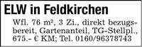 ELW in FeldkirchenWfl. 76 m², 3 Zi., direkt bezugsbereit, Gartenanteil, TG-Stellpl., 675.- € KM; Tel. ***