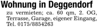 Wohnung in Deggendorfzu vermieten; ca. 60 qm, 2. OG, Terrasse, Garage, eigener Eingang, Tel. ***