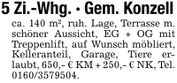 5 Zi.-Whg. - Gem. Konzellca. 140 m², ruh. Lage, Terrasse m. schöner Aussicht, EG + OG mit Treppenlift, auf Wunsch möbliert, Kelleranteil, Garage, Tiere erlaubt, 650,- € KM + 250,- € NK, Tel. ***.