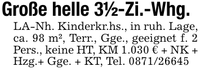 Große helle 3 1/2-Zi.-Whg.LA-Nh. Kinderkr.hs., in ruh. Lage, ca. 98 m², Terr., Gge., geeignet f. 2 Pers., keine HT, KM 1.030 € + NK + Hzg.+ Gge. + KT, Tel. ***