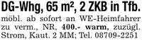 DG-Whg, 65 m², 2 ZKB in Tfb. möbl. ab sofort an WE-Heimfahrer zu verm., NR, 400.- warm, zuzügl. Strom, Kaut. 2 MM; Tel. ***
