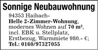 Sonnige Neubauwohnung 94353 Haibach-Helle 2-Zimmer-Wohnung,modernes Wohnen auf 70 m²,incl. EBK u. Stellplatz,Erstbezug, Warmmiete 980.- €;Tel.: ***