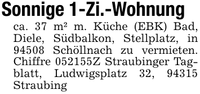 Sonnige 1-Zi.-Wohnungca. 37 m² m. Küche (EBK) Bad, Diele, Südbalkon, Stellplatz, in 94508 Schöllnach zu vermieten. Chiffre ***Z Straubinger Tagblatt, Ludwigsplatz 32, 94315 Straubing