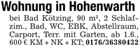 Wohnung in Hohenwarthbei Bad Kötzing, 90 m², 2 Schlafzim., Bad, WC, EBK, Abstellraum, Carport, Terr. mit Garten, ab 1.6., 600 € KM + NK + KT; ***