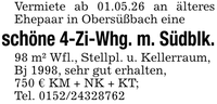 Vermiete ab 01.05.26 an älteres Ehepaar in Obersüßbach eineschöne 4-Zi-Whg. m. Südblk.98 m² Wfl., Stellpl. u. Kellerraum,Bj 1998, sehr gut erhalten,750 € KM + NK + KT;Tel. ***