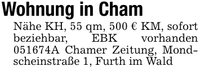 Wohnung in ChamNähe KH, 55 qm, 500 € KM, sofort beziehbar, EBK vorhanden ***A Chamer Zeitung, Mondscheinstraße 1, Furth im Wald