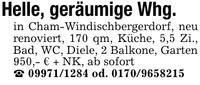 Helle, geräumige Whg.in Cham-Windischbergerdorf, neu renoviert, 170 qm, Küche, 5,5 Zi., Bad, WC, Diele, 2 Balkone, Garten950,- € + NK, ab sofort_ *** od. ***