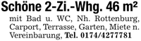 Schöne 2-Zi.-Whg. 46 m²mit Bad u. WC, Nh. Rottenburg, Carport, Terrasse, Garten, Miete n. Vereinbarung, Tel. ***