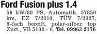 Ford Fusion plus 1.459 kW/80 PS, Automatik, 57850 km, EZ 7/2010, TÜV 7/2027, 8-fach bereift, polar-silber, top Zust., VB 5100.- €. Tel. ***