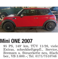 Mini ONE *** PS, 149' km, TÜV 11/26, viele Extras, scheckheftgepfl., Service, Bremsen u. Steuerkette neu, 8fach ber., VB 3.600.-; Tel. ***