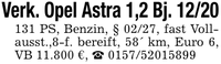 Verk. Opel Astra 1,2 Bj. *** PS, Benzin, § 02/27, fast Vollausst.,8-f. bereift, 58' km, Euro 6, VB 11.800 €, _ ***