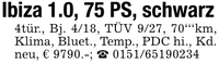 Ibiza 1.0, 75 PS, schwarz4tür., Bj. 4/18, TÜV 9/27, 70'''km, Klima, Bluet., Temp., PDC hi., Kd. neu, € 9790.-; _ ***