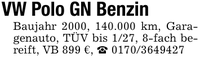 VW Polo GN Benzin Baujahr 2000, 140.000 km, Garagenauto, TÜV bis 1/27, 8-fach bereift, VB 899 €, _ ***