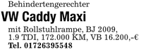 BehindertengerechterVW Caddy Maximit Rollstuhlrampe, BJ 2009,1.9 TDI, 172.000 KM, VB 16.200,-€Tel. ***