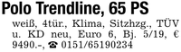 Polo Trendline, 65 PSweiß, 4tür., Klima, Sitzhzg., TÜV u. KD neu, Euro 6, Bj. 5/19, € 9490.-, _ ***