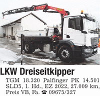 LKW Dreiseitkipper TGM 18.320 Palfinger PK 14.501 SLD5, 1. Hd., EZ 2022, 27.009 km, Preis VB, Fa. _ ***