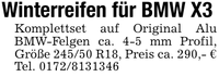 Winterreifen für BMW X3Komplettset auf Original Alu BMW-Felgen ca. 4-5 mm Profil, Größe 245/50 R18, Preis ca. 290,- € Tel. ***