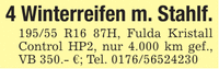 4 Winterreifen m. Stahlf.195/55 R16 87H, Fulda Kristall Control HP2, nur 4.000 km gef., VB 350.- €; Tel. ***