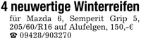 4 neuwertige Winterreifenfür Mazda 6, Semperit Grip 5, 205/60/R16 auf Alufelgen, 150,-€_ ***