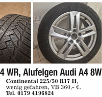4 WR, Alufelgen Audi A4 8WContinental 225/50 R17 H,wenig gefahren, VB 360,- €.Tel. ***