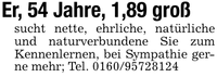 Er, 54 Jahre, 1,89 großsucht nette, ehrliche, natürliche und naturverbundene Sie zum Kennenlernen, bei Sympathie gerne mehr; Tel. ***