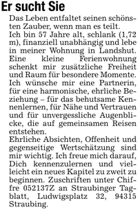 Er sucht Sie Das Leben entfaltet seinen schönsten Zauber, wenn man es teilt.Ich bin 57 Jahre alt, schlank (1,72 m), finanziell unabhängig und lebe in meiner Wohnung in Landshut. Eine kleine Ferienwohnung schenkt mir zusätzliche Freiheit und Raum für besondere Momente.Ich wünsche mir eine Partnerin, für eine harmonische, ehrliche Beziehung - für das behutsame Kennenlernen, für Nähe und Vertrauen und für unvergessliche Augenblicke, die auf gemeinsamen Reisen entstehen.Ehrliche Absichten, Offenheit und gegenseitige Wertschätzung sind mir wichtig. Ich freue mich darauf, Dich kennenzulernen und vielleicht ein neues Kapitel zu zweit zu beginnen. Zuschriften unter Chiffre ***Z an Straubinger Tagblatt, Ludwigsplatz 32, 94315 Straubing.