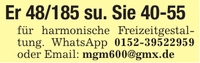 Er 48/185 su. Sie 40-55 für harmonische Freizeitgestaltung. WhatsApp *** oder Email: mgm600@gmx.de