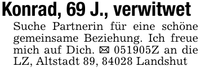 Konrad, 69 J., verwitwetSuche Partnerin für eine schöne gemeinsame Beziehung. Ich freue mich auf Dich. _ ***Z an die LZ, Altstadt 89, 84028 Landshut