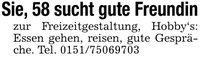 Sie, 58 sucht gute Freundinzur Freizeitgestaltung, Hobby's: Essen gehen, reisen, gute Gespräche. Tel. ***