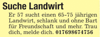 Suche Landwirt Er 57 sucht einen 65-75 jährigen Landwirt, schlank und ohne Bart für Freundschaft und mehr. Trau dich, melde dich. ***