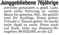 Junggebliebene 76jährigezierliche, gutausseh. u. gepfl. Lady, noch voller Schwung su. netten Mann für gemeins. Std., die gefüllt sind für Ausflüge, Essen gehen, Urlaube u. Tanzen gehen. Es macht mehr Spaß zu zweit. Freue mich auf Euch, bitte nur Festnetz-Nr. angeben; _ ***Z an die LZ